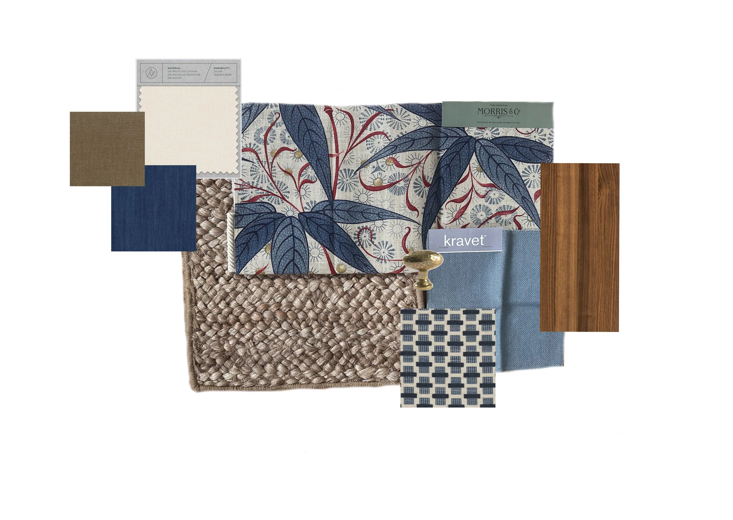 A layered living room palette that pairs natural materials with more tradition patterns to create a space that feels comfortable and inviting.